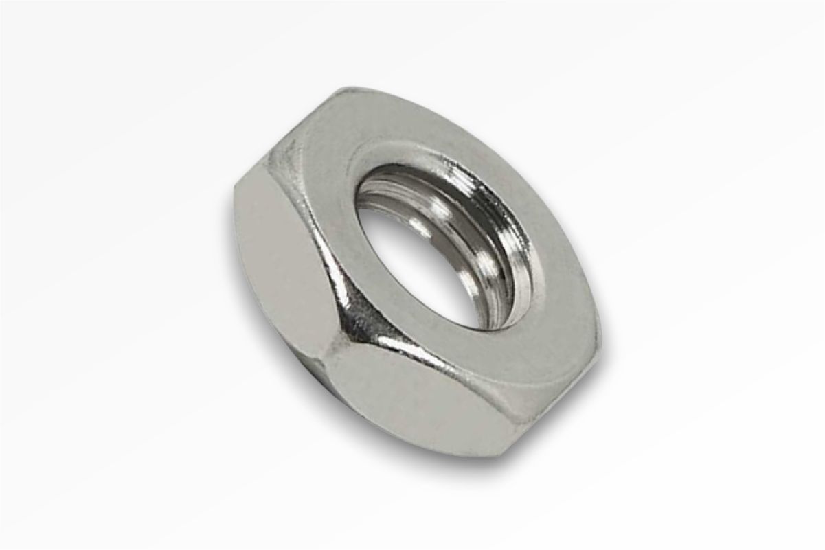 Uma porca sextavada com altura reduzida (mais fina que a porca padrão). É usada para travar outra porca (atuando como "contraporca"), impedindo que ela se solte, ou em locais com pouco espaço vertical.
