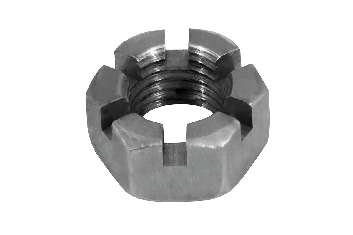 Usada em montagens com pinos ou contrapinos, a porca castelo oferece segurança adicional contra afrouxamento, ideal para fixações mecânicas críticas.